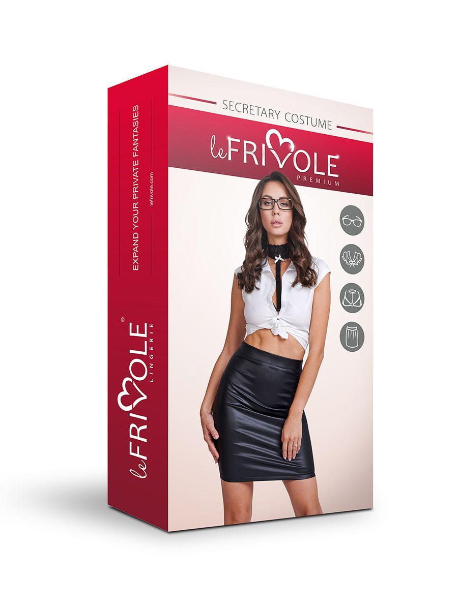 Начальник явно одобрит такое декольте, а если показать как расстегивается юбка, то и повышение можно получить. В комплекте: блузка, бюстгальтер/портупея, юбка, очки.