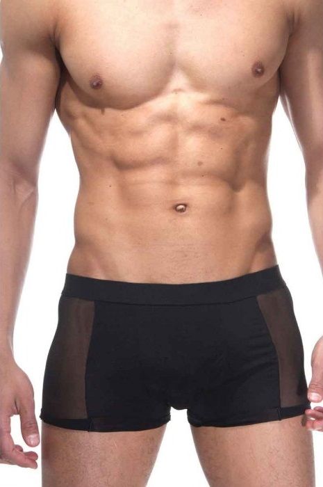 Мужские трусы-боксеры черного цвета с низкой посадкой. По бокам полупрозрачные вставки.
