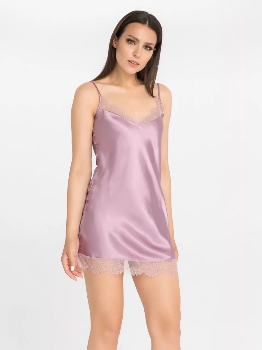 Короткая сорочка на узких бретелях из искусственного шелка, декорирована кружевом по подолу и линии декольте.