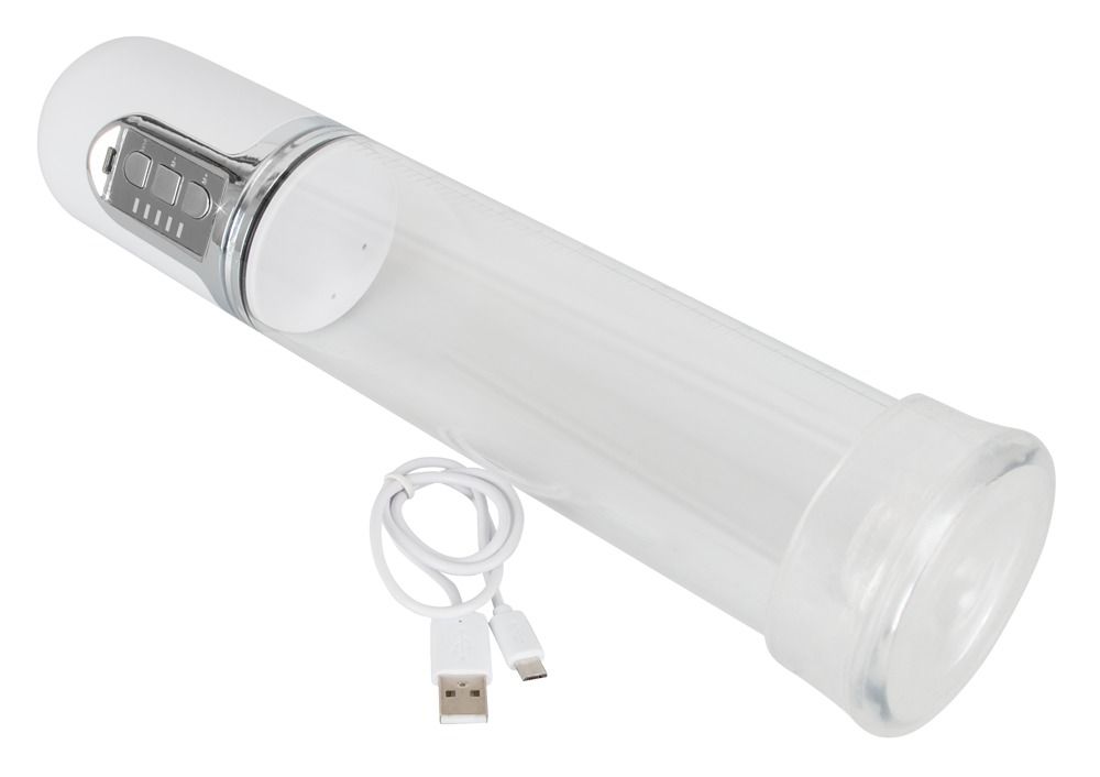 Прозрачная автоматическая вакуумная помпа для пениса с серебристой панелью управления с 3 кнопками. Помпа также имеет измерительную шкалу в сантиметрах и дюймах. Перезаряжается с помощью прилагаемого USB-кабеля. Рабочая длина - 20 см.