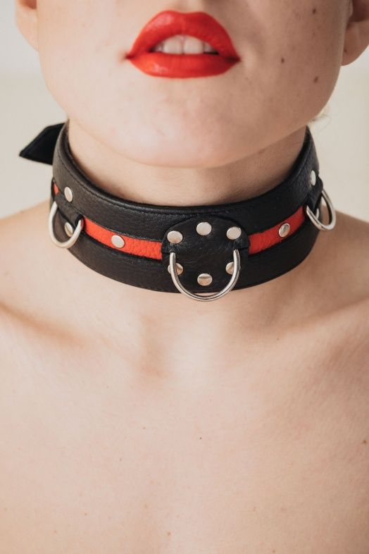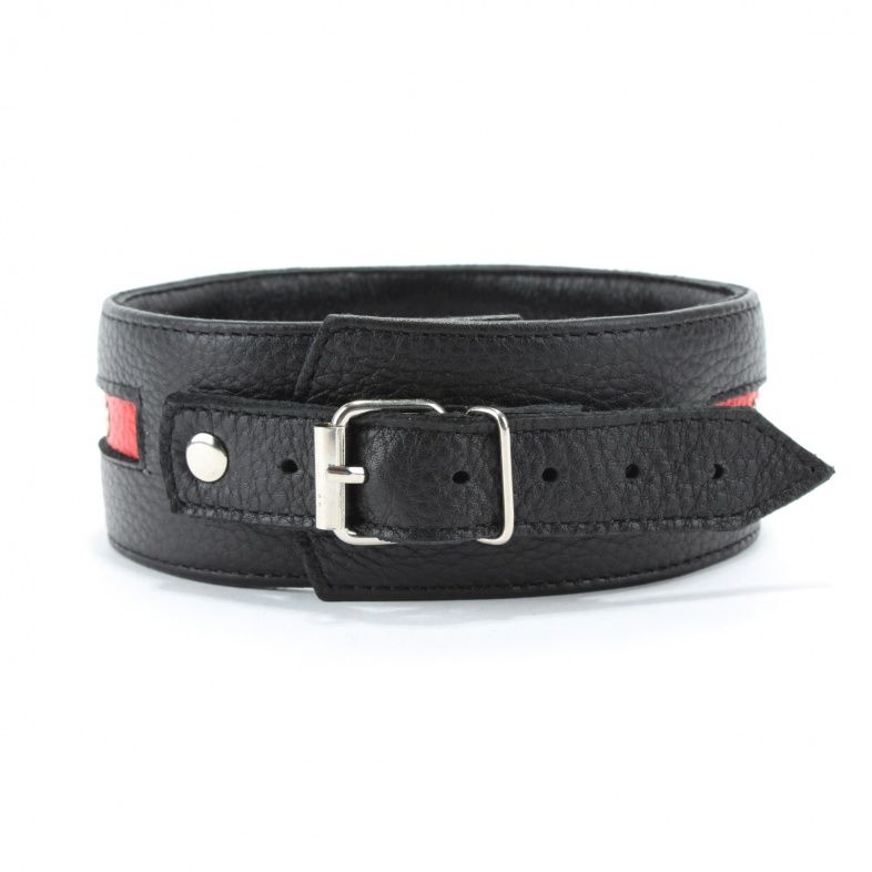 Стильный ошейник с красной полосой и металлическими заклепками обязательно понравится любителям БДСМ-игр. К пряжке можно пристегнуть поводок или наручники.